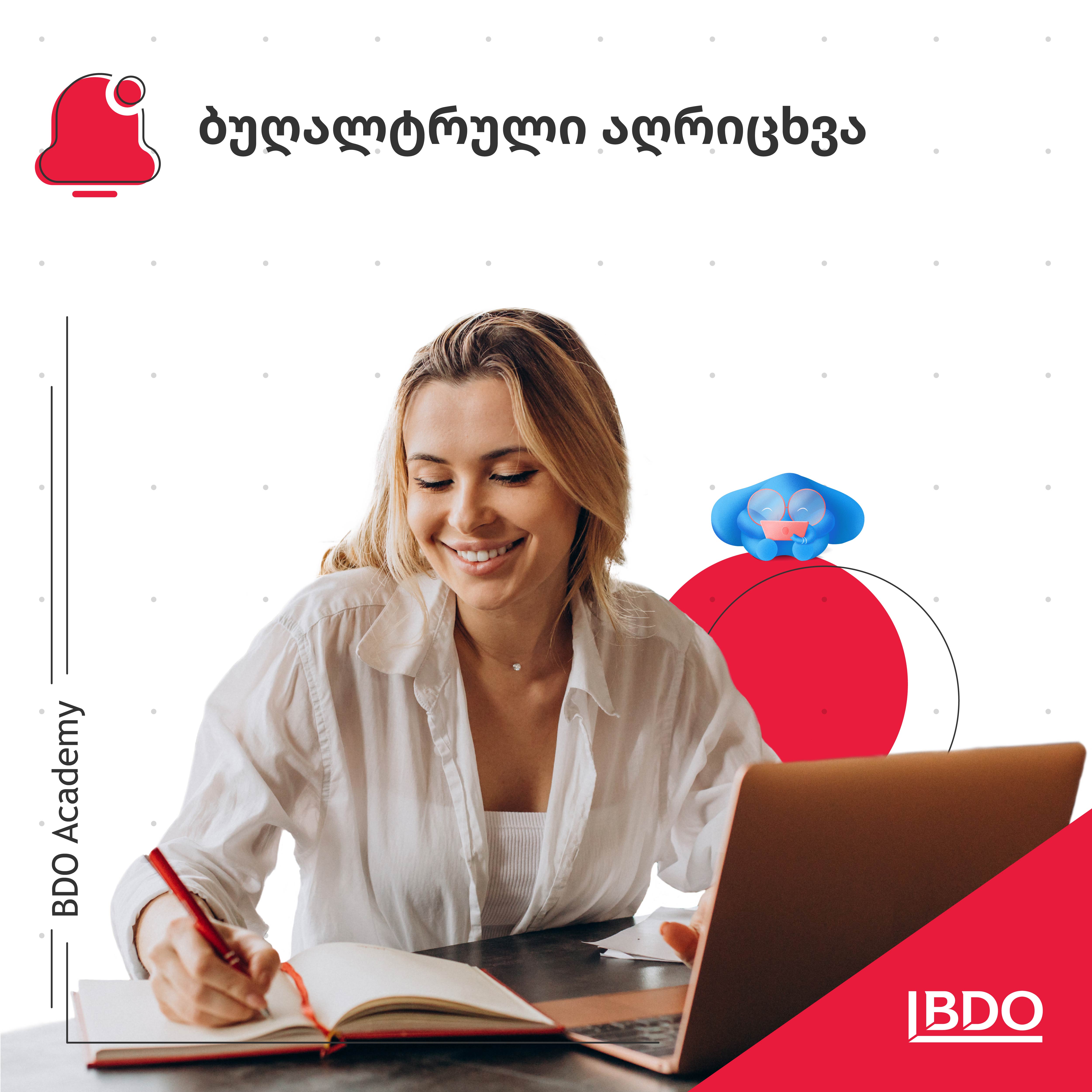 დღეები: ორშაბათი - ოთხშაბათი. კურსის ფარგლებში გაეცნობიან ბუღალტრული აღრიცხვისა და ანგარიშგების სტანდარტებს, შეისწავლიან ძირითად პრინციპებსა და საგადასახადო კანონმდებლობას. ასევე გაეცნობიან პროგრამა "ბალანსს", რომლის საშუალებითაც მიღებულ თეორიულ ცოდნას პრაქტიკაში განამტკიცებენ.